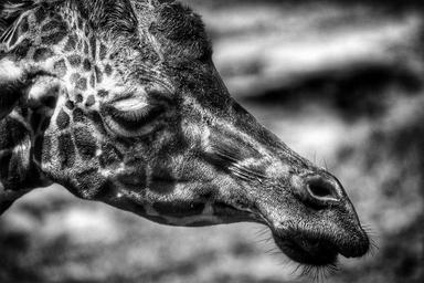 Keywords: giraffe head face portrait black and white profile mammal mouth ears cute