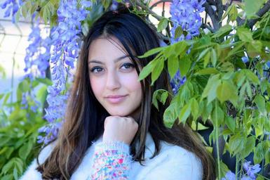 Keywords: girl brown eyes flowers fence mov brunette beauty portrait