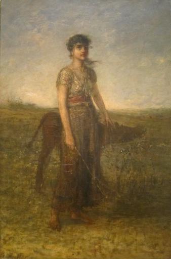 Keywords: 'Girl and Calf (Led through Meadows)' by George Fuller.JPG en Girl and Calf Led through Meadows oil on canvas painting by George Fuller 1883 De Young Museum own Wmpearl 1883 American paintings in the De Young Museum George Fuller Cc-zero