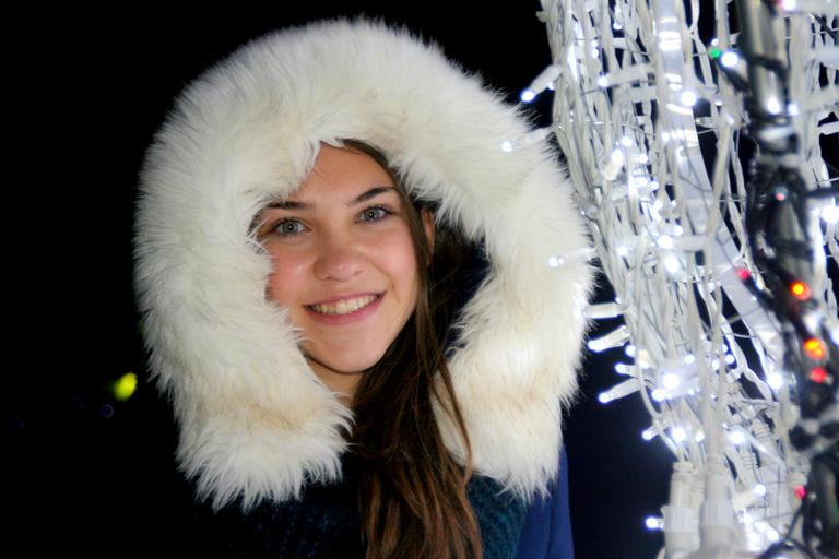 Keywords: girl fur hood lights holidays winter smile beauty