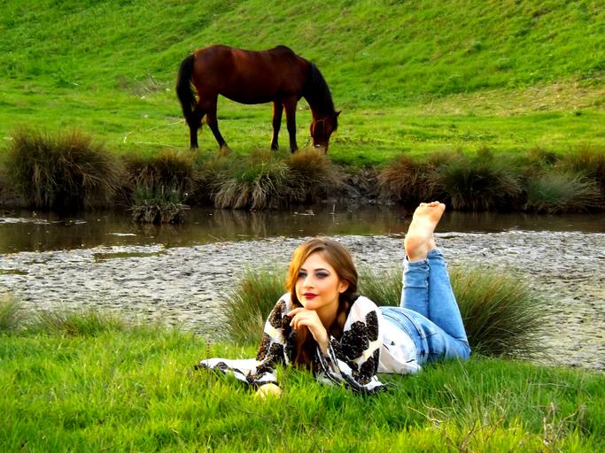 Keywords: girl horse rustic grass lake meadow green traditional