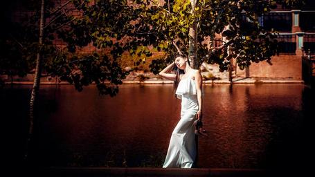 Keywords: girl in white dress keeps shoes hands hair golden model girl person posture view dress photoshoot female beauty woman hairstyle smiling hand eyes legs emotions fashion style