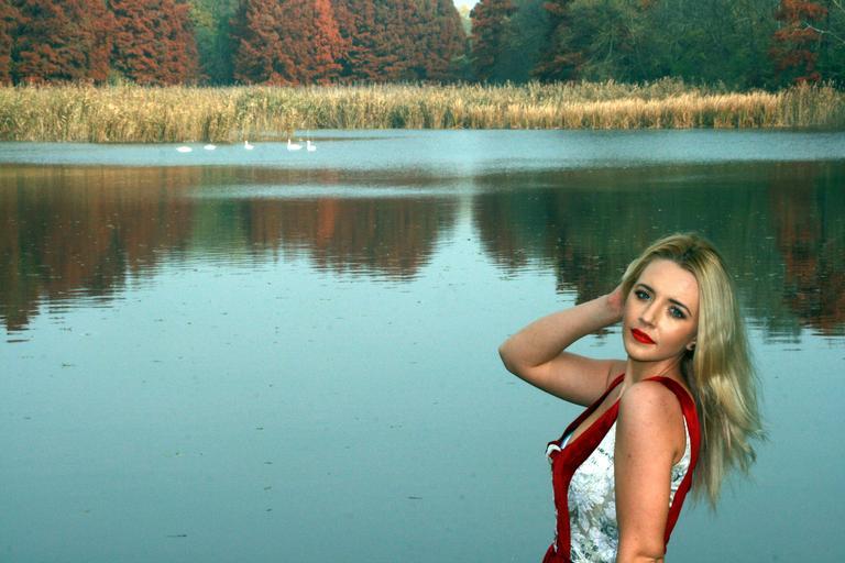Keywords: girl lake autumn tree reflection red blond forest