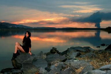 Keywords: girl lake sunset reflection in the evening beauty seductive