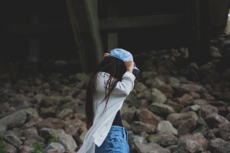 Keywords: girl person female young takinf off hat cap headgear headdress woman lifestyle fashion casual jeans hairstyle black long hiding