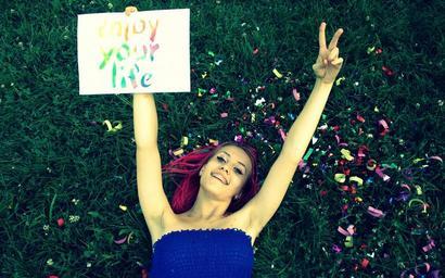 Keywords: girl pink hair grass confetti smile happiness