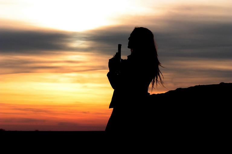 Keywords: girl pistol impuscatura gangster mission shadow in the evening sunset