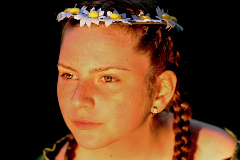 Keywords: girl portrait freckles wreath in the evening green eyes