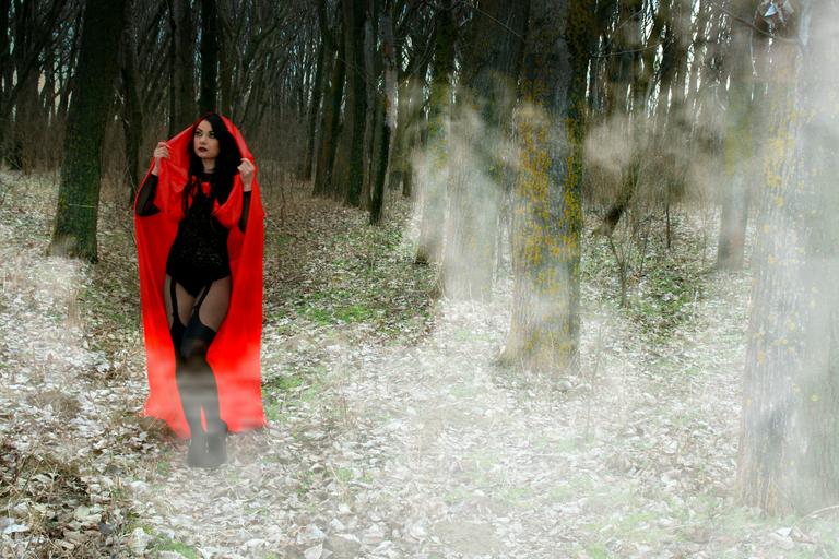 Keywords: girl red sensual smoke the haze forest red riding hood