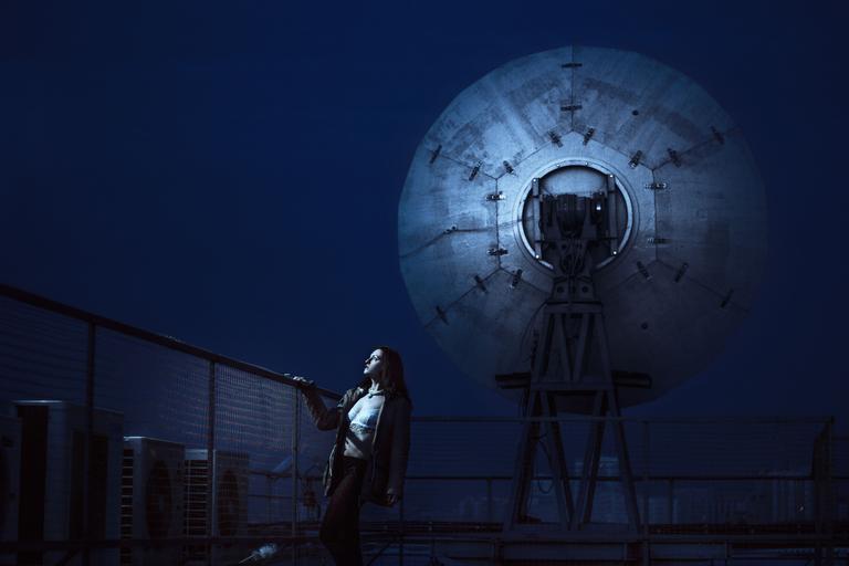 Keywords: girl satellite dishes antennas night lattice technology sky energy of technology light resources consumption dark