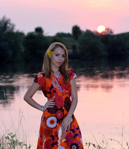 Keywords: girl sunset lake water reflection blonde beauty in the evening