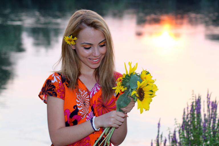Keywords: girl sunset sunflower lake water reflection blonde beauty in the evening