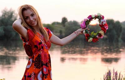 Keywords: girl sunset wreath lake water reflection blonde beauty in the evening