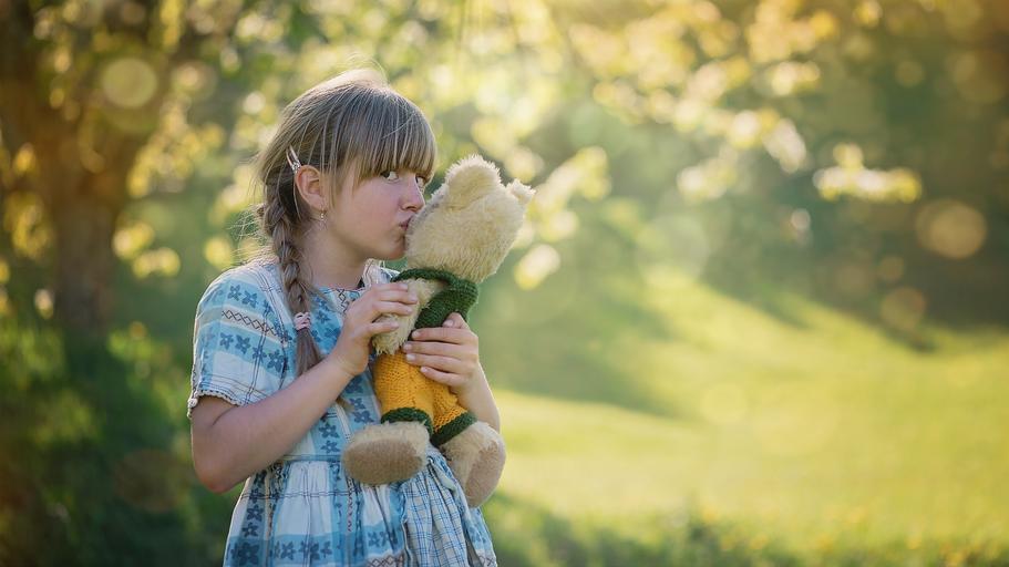 Keywords: girl teddy bear love kiss person human child teddy out nature portrait