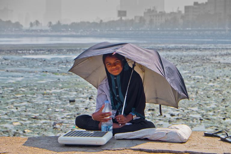 Keywords: girl umbrella laugh poverty beggar india indian city mumbai cityscape work