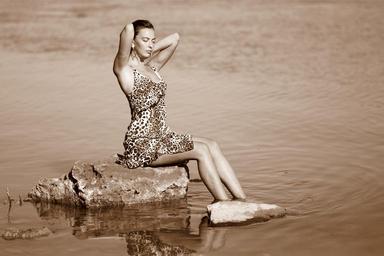 Keywords: girl wild water rock dress leopard beauty brown brunet summer