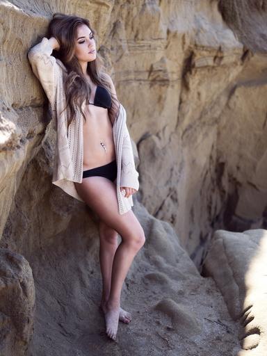 Keywords: girl woman beautiful long hair brown wavy posing skinny slim slender big shirt swimming suit sexy hot dark blue full body wall sand bikini