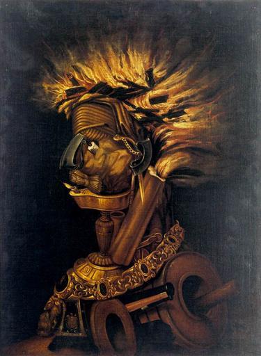 | Keywords: Giuseppe Arcimboldo - Fire - WGA0828.jpg Artwork Creator Giuseppe Arcimboldo ca 1572 Oil on canvas size cm 75 66 Private collection accession number object history credit line WGA link 828 http //www wga hu/art/a/arcimbol/3allegor/7elem3 jpg http //www wga hu/html/a/arcimbol/3allegor/7elem3 html PD-old-100 painting mythological Italian 1551-1600 The Four Elements Arcimboldo 1566 Allegories of fire 16th-century paintings in unidentified private collections 1560s oil on canvas paintings WGA form painting WGA type mythological WGA School Italian WGA time period 1551-1600 Men facing left in art Fire in paintings Anthropomorphic pareidolias by Giuseppe Arcimboldo 16th-century paintings in private collections |