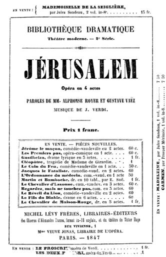 Keywords: Giuseppe Verdi - Jérusalem - titlepage of the libretto - Paris 1847.png en Giuseppe Verdi - Jérusalem - titlepage of the libretto - Paris 1847 1847 https //iiif lib harvard edu/manifests/view/drs 23072126 1i Giuseppe Verdi Alphonse Royer Gustave Vaëz other versions PD-old-70-1923 Jérusalem Libretti of operas by Giuseppe Verdi 1847 opera libretti |