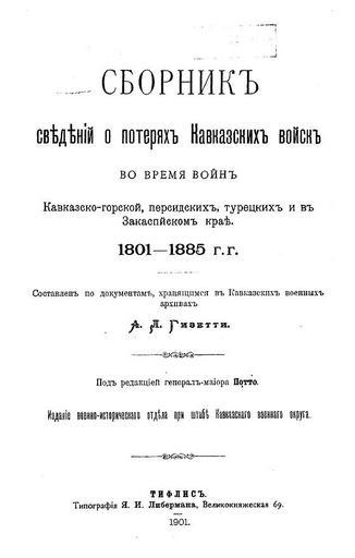 Keywords: Gizetti book cover. Tiflis, 1901.JPG en The cover of Anton Gizetti's book on Russian casualties in the wars in the Caucasus in the 19th century Published in Russian in Tbilisi 1901 1901 Гизетти А Л Сбо ник сведений о поте ях Кавказских войск во в емя войн Кавказско-го ской пе сидских ту ецких и в Закаспийском к ае 1801 1885 / Под ед В А Потто Тифлис 1901 Anton Gizetti Антон Людвигович Гизетти; 1836 1911 PD-Art Uploaded with UploadWizard Military history books Caucasian War 1817 1864 Books published in Tbilisi 1901 book covers