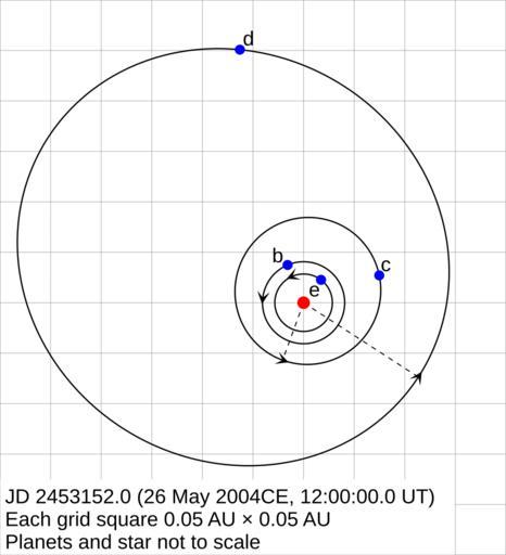 | Keywords: GJ581orbits.svg validSVG element in the SVG's source code gives further information <b>Assumptions </b> It is assumed that the system is coplanar This cannot be constrained by the radial velocity observations used to detect the planets in this system but our solar system's planets are nearly coplanar and both the systems of PSR B1257+12 planets B and C and Epsilon Eridani planet b and the circumstellar disk are coplanar see http //adsabs harvard edu/abs/2003ApJ 591L 147K Konacki and Wolszczan 2003 The Astrophysical Journal 591 L147 “L150 Masses and Orbital Inclinations of Planets in the PSR B1257+12 System and http //adsabs harvard edu/abs/2006AJ 132 2206B Beust et al 2006 The Astrophysical Journal 132 2206 “2218 The Extrasolar Planet É› Eridani b Orbit and Mass respectively so this assumption is at least reasonable The direction of rotation around the star is assumed to be the same for each planet Again this cannot be constrained by the current radial velocity observations but is a reasonable assumption since this is true for the major planets in our own solar system and is predicted by current theories of planet formation Under these first two assumptions the orientation of the orbits relative to each other is correct as depicted in this diagram however their actual orientation in 3D space with respect to external reference points e g the Sun the galactic centre is unknown hence such directions are not indicated on the diagram A further assumption is that the true masses of the planets are small compared to that of the star If the masses were comparable to that of the star the actual semimajor axis corresponding to the measured orbital period would be greater This assumption is supported both by probability the chance that we are observing a system which has sufficiently low inclination for this to be relevant is very low and by dynamical stability arguments which indicate that the planets cannot have true masses much more than 1 6 times their minimum masses Mayor et al 2009 This effect can therefore safely be neglected <b>Interpreting the diagram</b> The planetary orbits are drawn in orthographic projection as viewed from directly above the plane of the system so that the orbital direction is anticlockwise The dashed lines are drawn between the star and the periastron point of each planet in order to depict the relative orientation of the orbits with respect to each other The position of each planet in its orbit is calculated using the time of periastron in the table in the Mayor et al 2009 paper and are drawn at a time chosen to be close to the start of the Udry et al 2007 radial velocity observations which are available http //cdsarc u-strasbg fr/ftp/cats/J/A+A/469/L43/gl581 dat here This time is chosen to minimise the effects of both uncertainties in the orbital parameters and potential orbital evolution of the system While the orbits are drawn to the correct scale the star and the planets themselves are not shown to scale as they would be too small to see on the scale of this diagram In addition the true radii of the planets themselves are currently unknown as no direct observation of the planets has yet been made own Icalanise 2008-10-05 <gallery> File GJ581orbits Vogt2010 svg Planetary orbits according to Vogt et al 2010 incorporating orbit of unconfirmed super-Earth GJ 581 g </gallery> Gliese 581 Gliese 581 c Exoplanet diagrams |
