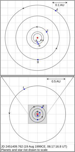| Keywords: GJ581orbits Vogt2010.svg en <b>Summary</b> SVG image of the Gliese 581 system orbits Plot of the orbits of the Gliese 581 system including the unconfirmed planet g Orbit data taken from Vogt et al 2010 http //arxiv org/abs/1009 5733 The Lick-Carnegie Exoplanet Survey A 3 1 M Š• Planet in the Habitable Zone of the Nearby M3V Star Gliese 581 The configuration is given in Table 2 The 6-planet solution quoted is for circular orbits thus eccentricities are not represented <b>Assumptions </b> It is assumed that the system is coplanar This cannot be constrained by the radial velocity observations used to detect the planets in this system but our solar system's planets are nearly coplanar and both the systems of PSR B1257+12 planets B and C and Epsilon Eridani planet b and the circumstellar disk are coplanar see http //adsabs harvard edu/abs/2003ApJ 591L 147K Konacki and Wolszczan 2003 The Astrophysical Journal 591 L147 “L150 Masses and Orbital Inclinations of Planets in the PSR B1257+12 System and http //adsabs harvard edu/abs/2006AJ 132 2206B Beust et al 2006 The Astrophysical Journal 132 2206 “2218 The Extrasolar Planet É› Eridani b Orbit and Mass respectively so this assumption is at least reasonable The direction of rotation around the star is assumed to be the same for each planet Again this cannot be constrained by the current radial velocity observations but is a reasonable assumption since this is true for the major planets in our own solar system and is predicted by current theories of planet formation Under these first two assumptions the orientation of the orbits relative to each other is correct as depicted in this diagram however their actual orientation in 3D space with respect to external reference points e g the Sun the galactic centre is unknown hence such directions are not indicated on the diagram A further assumption is that the true masses of the planets are small compared to that of the star If the masses were comparable to that of the star the actual semimajor axis corresponding to the measured orbital period would be greater This assumption is supported both by probability the chance that we are observing a system which has sufficiently low inclination for this to be relevant is very low and by dynamical stability arguments which indicate that the planets cannot have true masses much more than 1 6 times their minimum masses Mayor et al 2009 This effect can therefore safely be neglected <b>Interpreting the diagram</b> The planetary orbits are drawn in orthographic projection as viewed from directly above the plane of the system so that the orbital direction is anticlockwise The position of each planet in its orbit is given for the specified epoch given in the Vogt et al 2010 paper While the orbits are drawn to the correct scale the star and the planets themselves are not shown to scale as they would be too small to see on the scale of this diagram In addition the true radii of the planets themselves are currently unknown as no direct observation of the planets has yet been made own Icalanise 2008-10-05 <gallery> File GJ581orbits svg Configuration incorporating only the confirmed planets in the system </gallery> Gliese 581 Exoplanet diagrams Habitable zone |