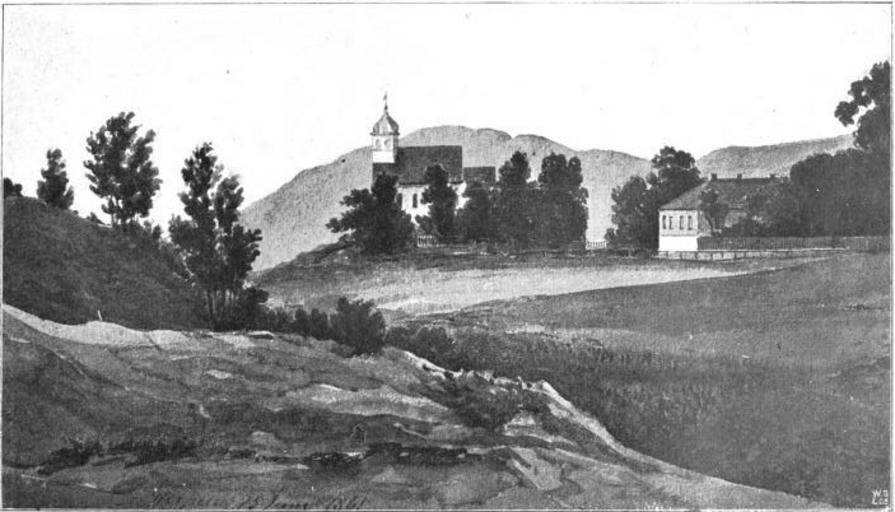 Keywords: Gjerpen kirke.png no Gjerpen kirke utenfor Skien Laura Larsen-Naur P A Munchs Levnet og Breve Kristiania Det norske Aktieforlag 1901 Author century 19 Gjerpen kirke PD-old