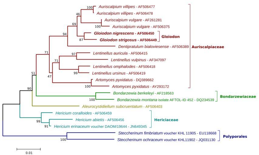 | Keywords: Gloiodon.svg Figure Evolutionary relationships of Gloiodon Minimum Evolution-Tree <br/> The evolutionary history was inferred using the Minimum Evolution method The optimal tree with the sum of branch length 0 30938192 is shown The percentage of replicate trees in which the associated taxa clustered together in the bootstrap test 1000 replicates are shown next to the branches The tree is drawn to scale with branch lengths in the same units as those of the evolutionary distances used to infer the phylogenetic tree The evolutionary distances were computed using the Maximum Composite Likelihood method and are in the units of the number of base substitutions per site The ME tree was searched using the Close-Neighbor-Interchange CNI algorithm at a search level of 2 The Neighbor-joining algorithm was used to generate the initial tree The analysis involved 21 nucleotide sequences All positions with less than 95 site coverage were eliminated That is fewer than 5 alignment gaps missing data and ambiguous bases were allowed at any position There were a total of 878 positions in the final dataset Phylogenetic and molecular evolutionary analyses were conducted using MEGA version 5 Tamura Peterson Peterson Stecher Nei and Kumar 2011 All sequences were obtained from the Genbank and were aligned by the Muscle algorithm with standard settings <br /> List of the GenBank Sequences http //www ncbi nlm nih gov/nuccore/AF506403 Aleurocystidiellum subcruentatum - AF506403 http //www ncbi nlm nih gov/nuccore/AY293172 Artomyces pyxidatus - AY293172 http //www ncbi nlm nih gov/nuccore/DQ389662 Artomyces pyxidatus - DQ389662 http //www ncbi nlm nih gov/nuccore/AF506477 Auriscalpium villipes - AF506477 http //www ncbi nlm nih gov/nuccore/AF506478 Auriscalpium villipes - AF506478 http //www ncbi nlm nih gov/nuccore/AF261281 Auriscalpium vulgare - AF261281 http //www ncbi nlm nih gov/nuccore/AF506375 Auriscalpium vulgare - AF506375 http //www ncbi nlm nih gov/nuccore/AF218563 Bondarzewia berkeleyi - AF218563 http //www ncbi nlm nih gov/nuccore/DQ234539 Bondarzewia montana isolate AFTOL-ID 452 - DQ234539 http //www ncbi nlm nih gov/nuccore/AF506389 Dentipratulum bialoviesense - AF506389 http //www ncbi nlm nih gov/nuccore/AF506450 Gloiodon nigrescens - AF506450 http //www ncbi nlm nih gov/nuccore/AF506449 Gloiodon strigosus - AF506449 http //www ncbi nlm nih gov/nuccore/AF506456 Hericium abietis - AF506456 http //www ncbi nlm nih gov/nuccore/AF506459 Hericium coralloides - AF506459 http //www ncbi nlm nih gov/nuccore/JN649345 Hericium erinaceum voucher DAOM/19644 - JN649345 http //www ncbi nlm nih gov/nuccore/AF506415 Lentinellus auricula - AF506415 http //www ncbi nlm nih gov/nuccore/AF506418 Lentinellus omphalodes - AF506418 http //www ncbi nlm nih gov/nuccore/AF506419 Lentinellus ursinus - AF506419 http //www ncbi nlm nih gov/nuccore/AF347097 Lentinellus vulpinus - AF347097 http //www ncbi nlm nih gov/nuccore/EU118668 Steccherinum fimbriatum voucher KHL 11905 - EU118668 http //www ncbi nlm nih gov/nuccore/JQ031130 Steccherinum ochraceum voucher KHL11902 - JQ031130 own 2013-04-05 User Thkgk Cc-zero Gloiodon |