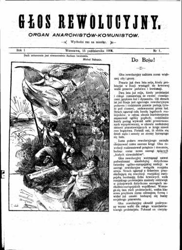 Keywords: Glos Rewolucyjny Nr1 Strona 01.jpg en First page of the polish anarchist journal Głos Rewolucyjny pl Pierwsza strona anarchistycznego periodyku Głos Rewolucyjny The library Author 1904-10-15 PD-old Periodicals about anarchism