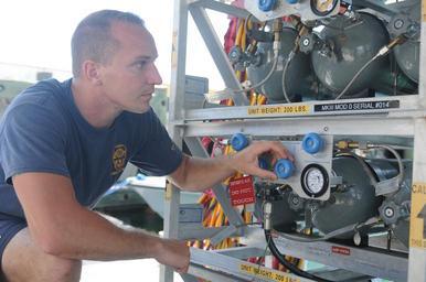 MAKE A MEME View Large Image Navy divers train during Project SEALAB anniversary 110720-N-MN220-366.jpg en Petty Officer 2nd Class Nick Barna a salvage and repair diver assigned to the Guantanamo Navy Dive Locker listens to air tanks filling while conducting a pre-dive ...