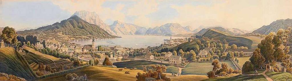 Keywords: Gmunden Panorama 19 Jh.jpg Austria century 19 aquatinta color cm 22 83 object history exhibition history credit line verlegt bei Weinmann accession number place of creation Gmunden Paintings of the Traunsee PD-Art