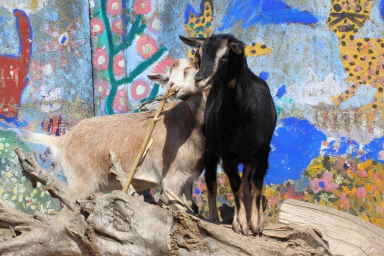 Keywords: goat grafitti tree trunks sun petting zoo