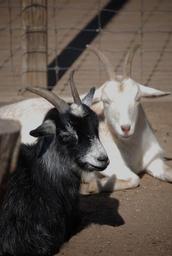 Keywords: goat zoo black white animal mammal wool fur farm cute hair head funny horns wild pet face petting laying purebred sunning lazy