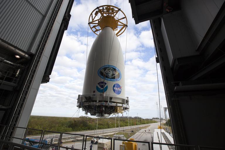 | Keywords: goes-r goesr noaa ula atlas v atlasv vif pad 41 pad41 lift mate centaur upper stage centaurupperstage nasa nesdis noaa satellites noaasatellites noaa satellite and information service noaasatelliteandinformationservice ksc countdowntolaunch roadtolaunch space segment spacesegment launch vehicle launchvehicle spacecraft next generation nextgeneration weather satellite weathersatellite satellite bestof A view from high up inside the Vertical Integration Facility at Space Launch Complex 41 at Cape Canaveral Air Force Station in Florida. A crane lifts the payload fairing containing NOAA's Geostationary Operational Environmental Satellite (GOES-R) for mating to the United Launch Alliance Atlas V Centaur upper stage. The fairing-encapsulated GOES-R spacecraft was mated with the launch vehicle on November 9, 2016. GOES-R is scheduled to launch aboard the Atlas V rocket on November 19. Photo credit: NASA/Ben Smegelsky For the latest on the GOES-R launch, visit www.nesdis.noaa.gov/GOES-R-Launch A view from high up inside the Vertical Integration Facility at Space Launch Complex 41 at Cape Canaveral Air Force Station in Florida. A crane lifts the payload fairing containing NOAA's Geostationary Operational Environmental Satellite (GOES-R) for mating to the United Launch Alliance Atlas V Centaur upper stage. The fairing-encapsulated GOES-R spacecraft was mated with the launch vehicle on November 9, 2016. GOES-R is scheduled to launch aboard the Atlas V rocket on November 19. Photo credit: NASA/Ben Smegelsky For the latest on the GOES-R launch, visit www.nesdis.noaa.gov/GOES-R-Launch |
