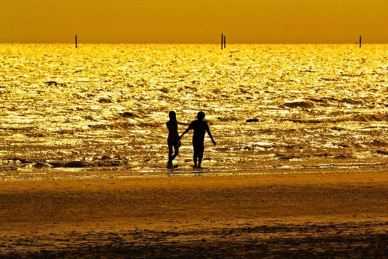 Keywords: gold sea black shadow couple pictures beach hand in hand woman men's evening walk tour romance thailand