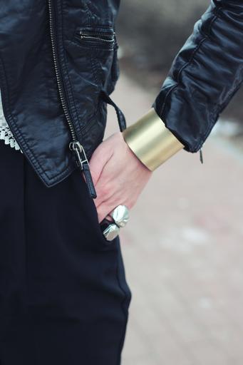 Keywords: gold-tone wide cuff gold jewellery jewelry ring rings leather jacket