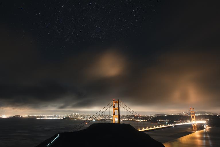 Keywords: golden gate bridge starry night cloudy sky structure bridge night glowing spotlight illuminated