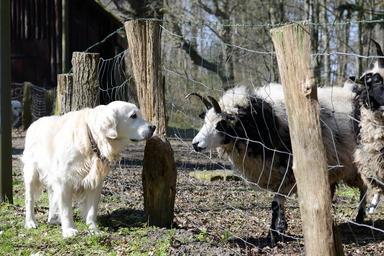 Keywords: golden retriever dogs animal portrait curious dog and goat wildlife photography
