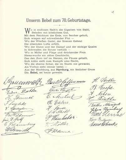 | Keywords: Goldenes Buch zum 70. Geburtstag August Bebel 1910 Seite 049.jpg Goldenes Buch zum 70 Geburtstag August Bebel 1910 Seite_ jpg 048 050 Glückwunschschreiben zum 70 Geburtstag von August Bebel SPD-Landesorganisation Hamburg August Bebel zum siebzigsten Geburtstag 22 Februar 1910 / mit einer Nachbemerkung von Ursula Herrmann Reprint des Unikats aus dem Zentralen Parteiarchiv der SED Dietz Verlag Berlin 1989 Lizenzausgabe Saur 1989 ISBN 3-598-07256-2 self scanned from own book 1910 Diverse Goldenes Buch zum 70 Geburtstag August Bebel 1910 PD-old-70-1923 |