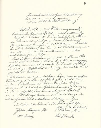 | Keywords: Goldenes Buch zum 70. Geburtstag August Bebel 1910 Seite 071.jpg Goldenes Buch zum 70 Geburtstag August Bebel 1910 Seite_ jpg 070 072 Glückwunschschreiben zum 70 Geburtstag von August Bebel Vorstand des Verbandes der Friseurgehilfen Deutschlands August Bebel zum siebzigsten Geburtstag 22 Februar 1910 / mit einer Nachbemerkung von Ursula Herrmann Reprint des Unikats aus dem Zentralen Parteiarchiv der SED Dietz Verlag Berlin 1989 Lizenzausgabe Saur 1989 ISBN 3-598-07256-2 self scanned from own book 1910 Diverse Goldenes Buch zum 70 Geburtstag August Bebel 1910 PD-old-70-1923 |