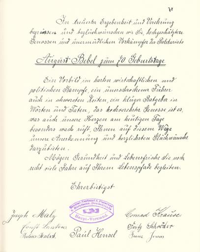 | Keywords: Goldenes Buch zum 70. Geburtstag August Bebel 1910 Seite 070.jpg Goldenes Buch zum 70 Geburtstag August Bebel 1910 Seite_ jpg 069 071 Glückwunschschreiben zum 70 Geburtstag von August Bebel Haupt-Vorstand des Zentral-Verbandes der Fleischer und Berufsgenossen Deutschlands August Bebel zum siebzigsten Geburtstag 22 Februar 1910 / mit einer Nachbemerkung von Ursula Herrmann Reprint des Unikats aus dem Zentralen Parteiarchiv der SED Dietz Verlag Berlin 1989 Lizenzausgabe Saur 1989 ISBN 3-598-07256-2 self scanned from own book 1910 Diverse Goldenes Buch zum 70 Geburtstag August Bebel 1910 PD-old-70-1923 |