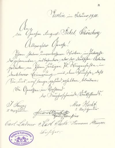 | Keywords: Goldenes Buch zum 70. Geburtstag August Bebel 1910 Seite 083.jpg Goldenes Buch zum 70 Geburtstag August Bebel 1910 Seite_ jpg 082 084 Glückwunschschreiben zum 70 Geburtstag von August Bebel Central-Vorstand des Verbandes der Kupferschmiede Deutschlands August Bebel zum siebzigsten Geburtstag 22 Februar 1910 / mit einer Nachbemerkung von Ursula Herrmann Reprint des Unikats aus dem Zentralen Parteiarchiv der SED Dietz Verlag Berlin 1989 Lizenzausgabe Saur 1989 ISBN 3-598-07256-2 self scanned from own book 1910 Diverse PD-old-70-1923 Goldenes Buch zum 70 Geburtstag August Bebel 1910 |