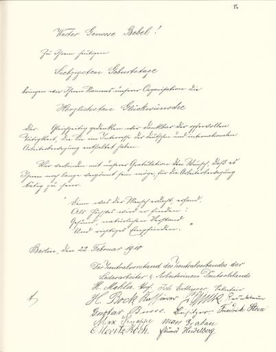 | Keywords: Goldenes Buch zum 70. Geburtstag August Bebel 1910 Seite 086.jpg Goldenes Buch zum 70 Geburtstag August Bebel 1910 Seite_ jpg 085 087 Glückwunschschreiben zum 70 Geburtstag von August Bebel Zentralvorstand des Zentralverbandes der Lederarbeiter und Arbeiterinnen Deutschlands August Bebel zum siebzigsten Geburtstag 22 Februar 1910 / mit einer Nachbemerkung von Ursula Herrmann Reprint des Unikats aus dem Zentralen Parteiarchiv der SED Dietz Verlag Berlin 1989 Lizenzausgabe Saur 1989 ISBN 3-598-07256-2 self scanned from own book 1910 Diverse PD-old-70-1923 Goldenes Buch zum 70 Geburtstag August Bebel 1910 |