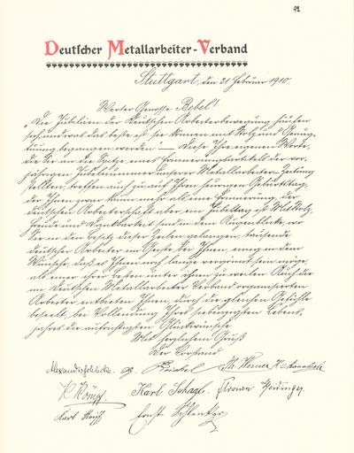 | Keywords: Goldenes Buch zum 70. Geburtstag August Bebel 1910 Seite 092.jpg Goldenes Buch zum 70 Geburtstag August Bebel 1910 Seite_ jpg 091 093 Glückwunschschreiben zum 70 Geburtstag von August Bebel Vorstand des Deutschen Metallarbeiter-Verbandes August Bebel zum siebzigsten Geburtstag 22 Februar 1910 / mit einer Nachbemerkung von Ursula Herrmann Reprint des Unikats aus dem Zentralen Parteiarchiv der SED Dietz Verlag Berlin 1989 Lizenzausgabe Saur 1989 ISBN 3-598-07256-2 self scanned from own book 1910 Diverse PD-old-70-1923 Goldenes Buch zum 70 Geburtstag August Bebel 1910 |