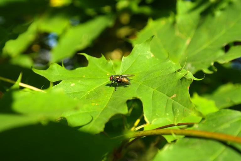 Keywords: goldfliege fly insect leaves tree maple lucilia sericata bluebottle calliphoridae lucilia leaf green maple leaf silver maple acer saccharinum acer