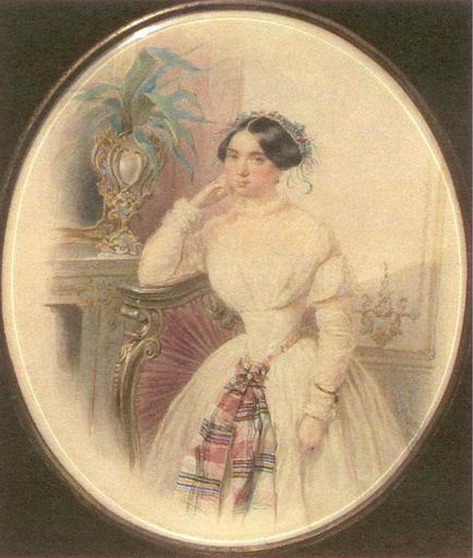 Keywords: Golitsyna Sumarokova.jpg Княгиня а ия Се геевна Голицына у Сума окова 1830 1902 замужем с 1849 года за сенато ом обе -гофмейсте ом князем Голицыным 1820 1885 скан 1850 Ш ейнце Ка л атвеевич House of Sumarokov House of Golitsyn Maria Serg 1850s portraits of Russia female Karl-August Matveevich Schreinzer PD-old |