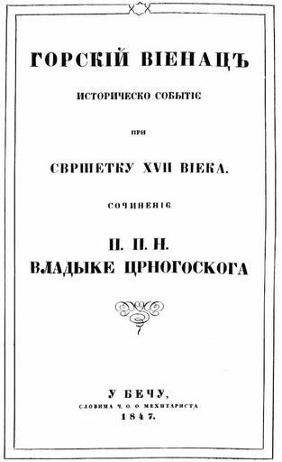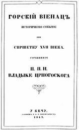 | Keywords: Gorski Vijenac.jpg The Mountain Wreath by Petar II Petrović-Njegoš 1847 cite book Petar II Petrović-Njegoš Gorski vijenac The Mountain Wreath 1847 Vienna ; scan uploaded at cite web The Mountain Wreath 22 August 2001 1847 http //www njegos org/gvijenac/ Serb Land of Montenegro Petar II Petrović-Njegoš 1847 PD-old-100 njegos org GFDL relicense Gorski vijenac 1847 Montenegro in the 19th century | ||||