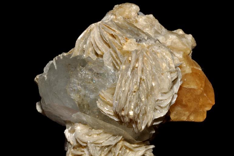 Keywords: Goschénite, scheelite et mica (Chine).jpg Cristal de Goshénite et de Scheelite et Mica Own 2009-01-21 Parent Géry Goshenite Scheelite Beryl and muscovite Taken with Nikon D90