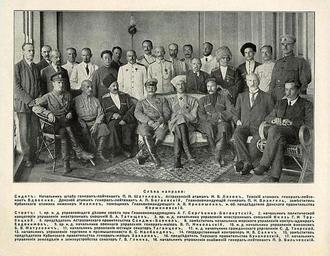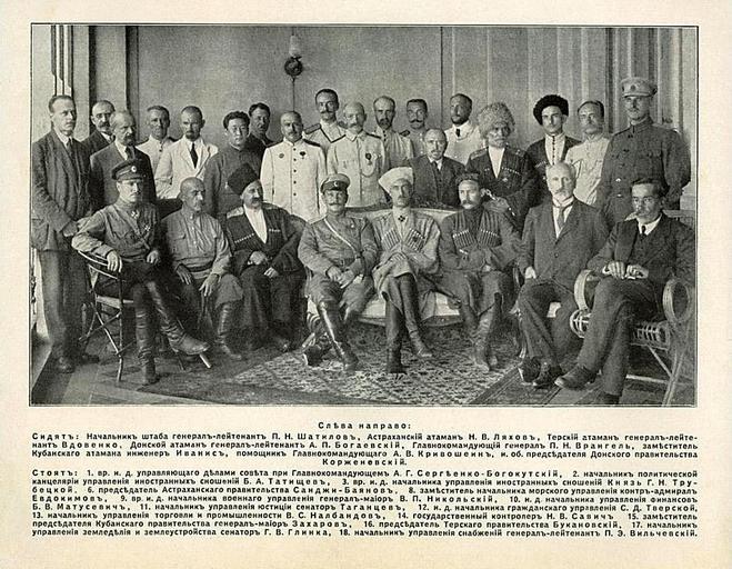 Keywords: Government of South Russia 1920.JPG en The Government of South Russia Crimea Sevastopol 1920 Sitting from left to right 1 - Chief of Staff Major General P N Shatilov; 2 - Astrakhan Ataman N V Lyakhov; 3 - Terek Ataman Lieutenant General G A Vdovenko; 4 - Don Ataman Lieutenant General A P Bogaevsky; 5 Сommander- in-Chief of the Russian Army General P N Wrangel; 6 - Deputy Kuban Ataman engineer V N Ivanis; 7 - Assistant of Сommander- in-Chief Head of Government A V Krivoshein; 8 Acting Chairman of the Don Government Korzhenevskiy Standing from left to right 1 Acting Director of Council Affairs by Сommander- in-Chief A G Sergeenko-Bogokutskiy; 2 Chief of Political Office of the Department of Foreign Affairs B A Tatishchev; 3 Acting Director of Foreign Affairs Prince G N Trubetskoy; 6 - Chairman of the Astrakhan Government Sanji-Bayanov; 8 - Deputy Chief of the Naval Department Counter Admiral S V Evdokimov; 9 Acting Chief of the Military Department Major General V P Nikolskiy; 10 Acting Head of Finance B V Matusevich; 11 - Head of the Department of Justice Senator N N Tagantsev; 12 Acting Director of the Civil Department S D Tverskoy; 13 - Head of the Department of Trade and Industry V S Nalbandov; 14 - State Comptroller N V Savich; 15 - Vice-Chairman of the Kuban Government Major General I A Zakharov; 16 - Chairman of the Terek Government Bukanovskiy; 17 - Head of the Department of Agriculture and Land Management Senator G V Glinka; 18 - Head of Office Supplies Lieutenant General P E Vilchevskiy ru П авительство Юга России К ым Севастополь 1920 Сидят слева нап аво 1 - начальник штаба гене ал-майо П Шатилов; 2 - Аст аханский атаман В Ляхов; 3 - Те ский атаман гене ал-лейтенант Г А Вдовенко; 4 - Донской атаман гене ал-лейтенат А П Богаевский; 5 - Главнокомандующий Русской а мией гене ал П В ангель; 6 заместитель Кубанского атамана инжене В Иванис; 7 помощник Главнокомандующего глава П авительства А В К ивошеин; 8 и об П едседателя Донского п авительства Ко женевский Стоят слева нап аво 1 в и д уп авляющего делами совета п и Главнокомандующем А Г Се геенко-Богокутский; 2 - начальник политической канцеля ии Уп авления иност анных сношений Б А Татищев; 3 - вp и д начальника Уп авления иност анных сношений князь Г Т убецкой; 6 - п едседатель Аст аханского п авительства Санджи-Баянов; 8 - заместитель начальника о ского уп авления конт -адми ал C B Евдокимов; 9 - вp и д начальника Военного уп авления гене ал-майо В П икольский; 10 - и д начальника Уп авления финансов Б В атусевич; 11 - начальник Уп авления юстиции сенато Таганцев; 12 - и д начальника Г ажданского уп авления С Д Тве ской; 13 - начальник уп авления то говли и п омышленности B C албандов; 14 - госуда ственный конт олё В Савич; 15 - заместитель п едседателя Кубанского п авительства гене ал-майо И А Заха ов; 16 - п едседатель Те ского п авительства Букановский; 17 начальник Уп авления земледелия и землеуст ойства сенато Г В Глинка; 18 - начальник Уп авления снабжений гене ал-лейтенант П Э Вильчевский http //vadimus58 livejournal com/ here /здесь unknown / неизвестно 1920 120px PD-old White Russians Pyotr Nikolayevich Wrangel Papakhi Civil war of Russia in Crimea Civil war of Russia 1920 Afrikan Bogayevsky