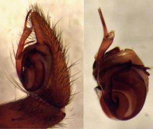 | Keywords: Gradungula sorenseni (male palp).jpg en Gradungula sorenseni topotype male palp photo taken by me S E Thorpe 2012-04-05 NEW ZEALAND WD Franz Josef L Wombat tk 200 m rata-kamahi-Fuchsia forest YPT 8-11 Nov 2007 J W Early AMNZ L16511 Gradungula sorenseni |